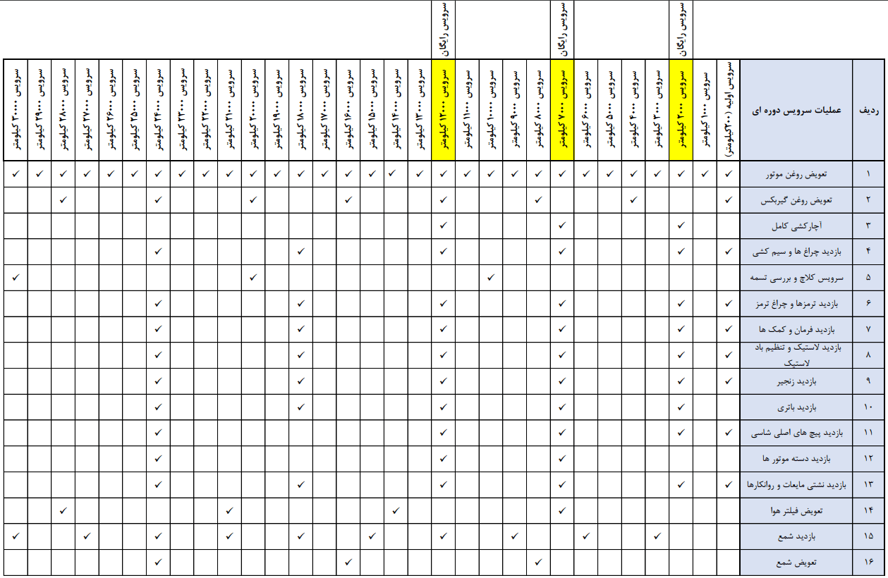 سرویسهای 2000 ،7000 و 12000 کیلومتر به شرط برقراری گارانتی برای مشتریان به صورت رایگان انجام میگردد.(هزینهی کلیه موارد مصرفی به عهده مشتری میباشد).